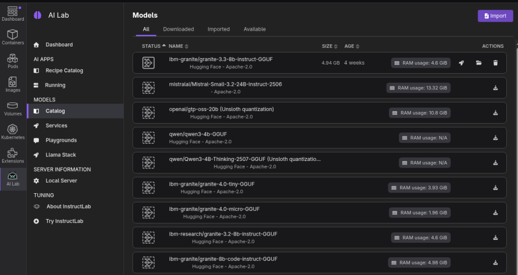 - Once installed, you’ll find in the left menu a new item “AI Lab” from there, navigate to Models > Catalog and choose a GGUF model to download from the list of avaialbe models.