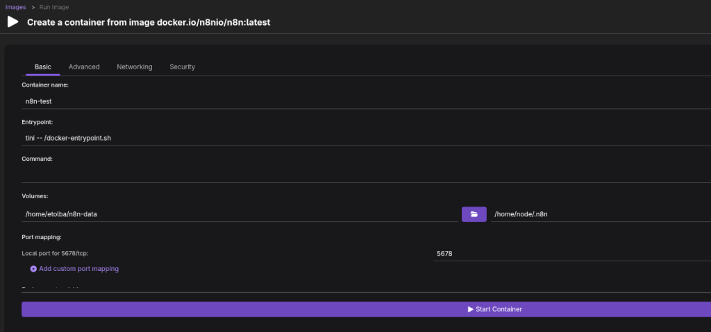 - Volume Mappings: Map the n8n_data folder from your host to the container path /home/node/.n8n.
