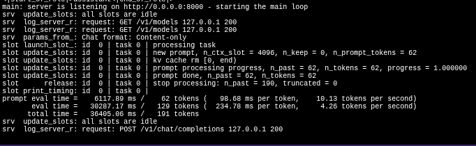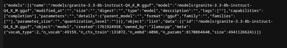 - Open a new browser tab and go to http://localhost:8080/v1/models. You should see a JSON response confirming the AI model is loaded and ready.