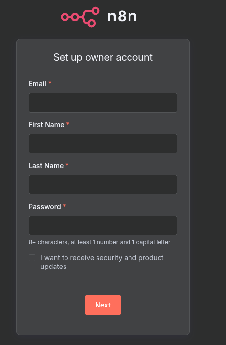 - Open your browser and go to http://localhost:5678. You should see the n8n setup screen. Create your admin account.