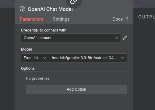 - Credential: Click to create a new credential. The API key doesn’t matter for local services, so enter any dummy text like local-key.